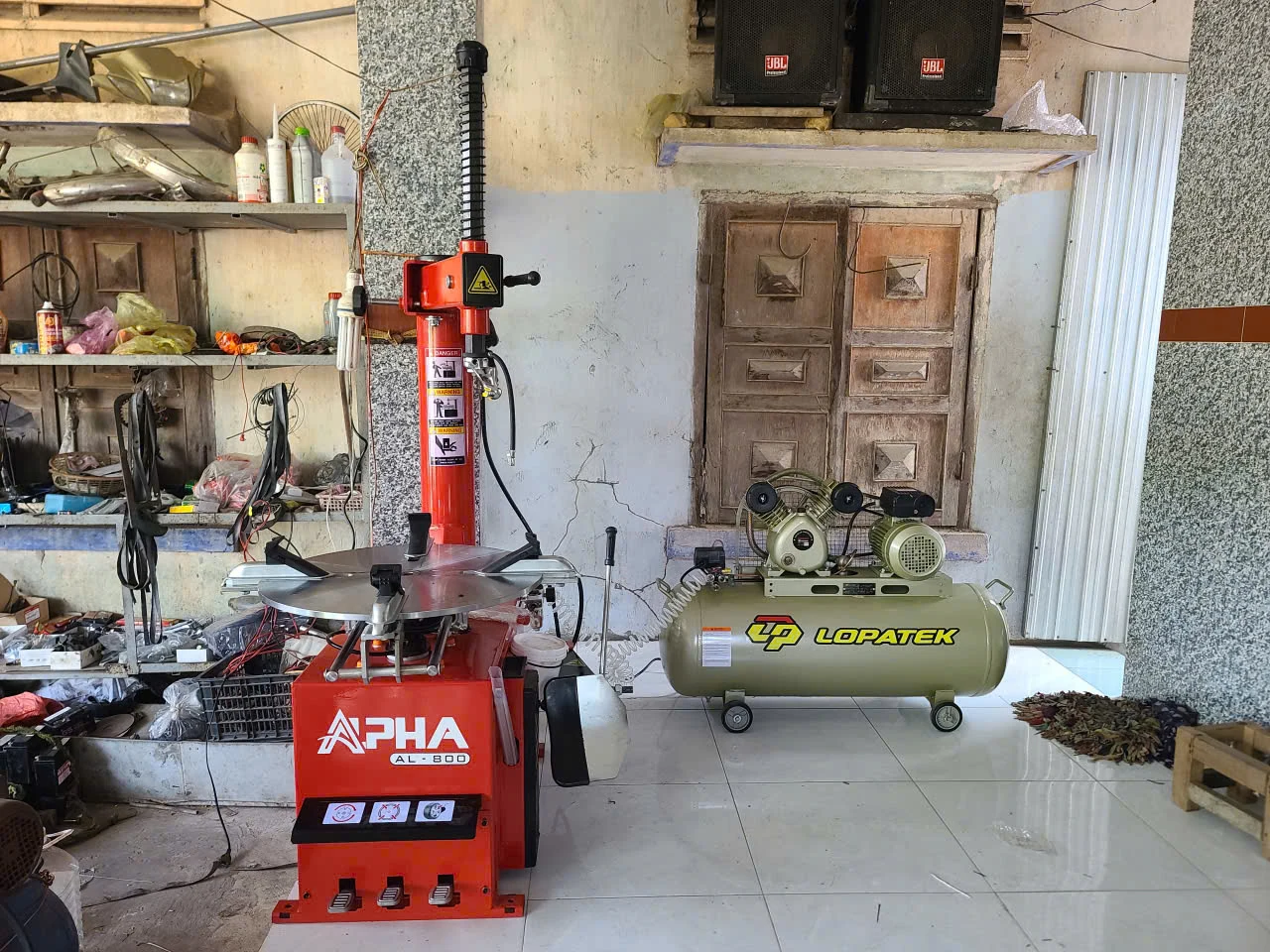 Hình ảnh thực tế: Máy nén khí Lopatek kết hợp cùng máy tháo vỏ xe trong quy trình làm lốp chuyên nghiệp.